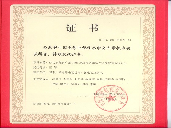 奖项名称:移动多媒体广播CMMB系统设备测试方法及检测系统研究