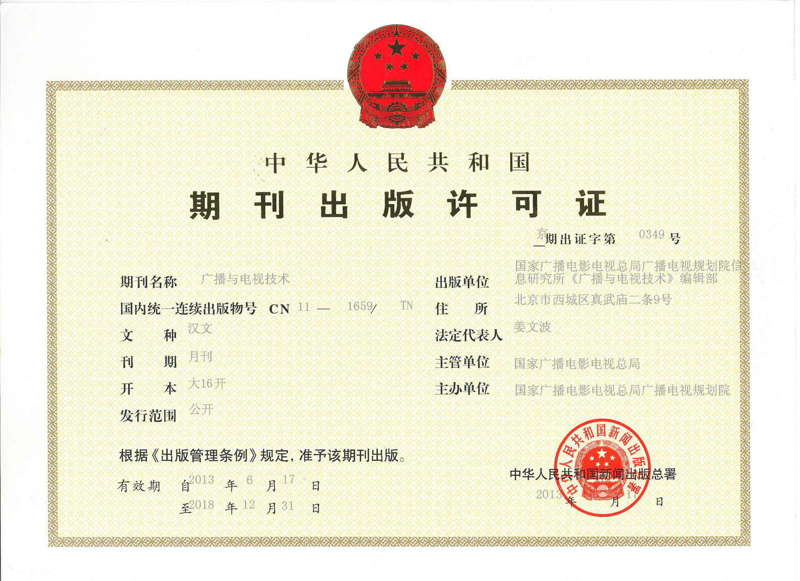 《广播电视与技术》出版许可证