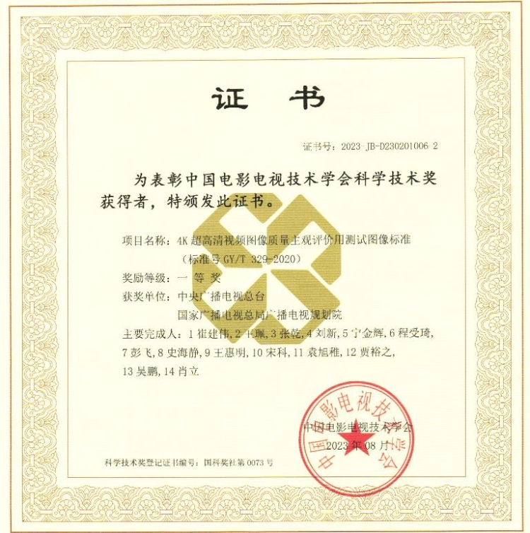 奖项名称:4K超高清视频图像质量主观评价用测试图像标准