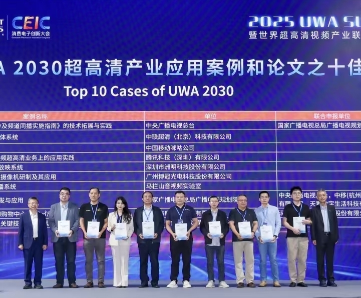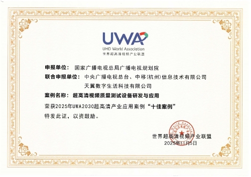 近日,在深圳举办的2025 UWA SUMMIT暨世界超高清视频产业联盟会员大会上,由国家广播电视总局广播电视规划院牵头,联合中央广播电视总台、中移(杭州)信息技术有限公司、天翼数字生活科技有限公司共同完成的 “超高清视频质量测试设备研发与应用”项目,荣获UWA 2025年超高清产业应用“十佳案例”称号。
